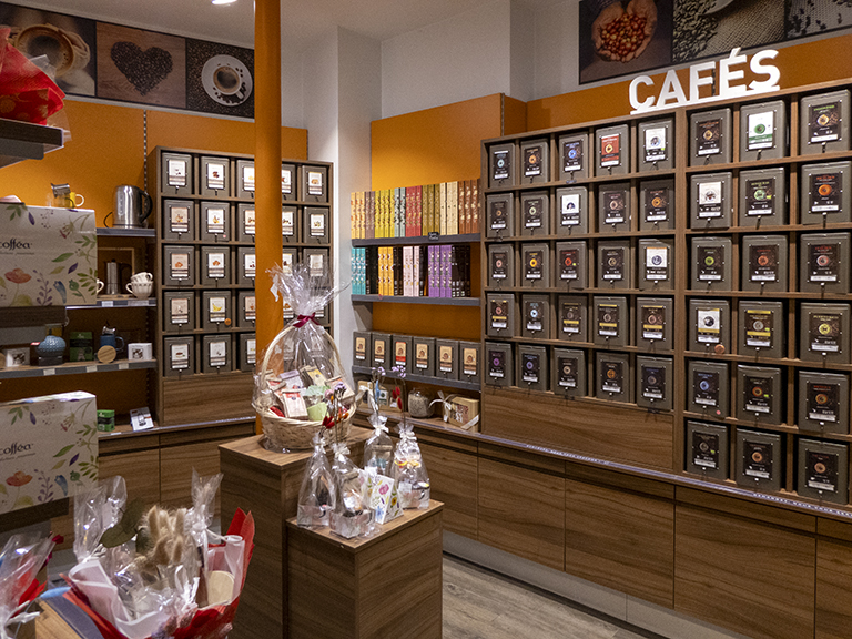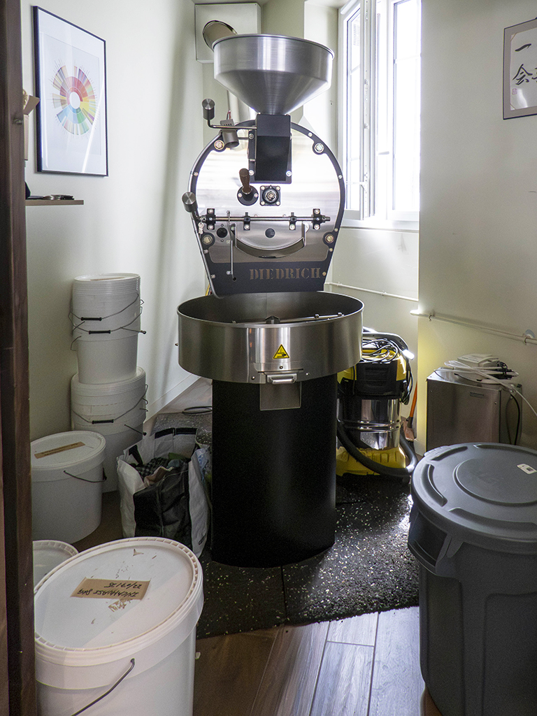 There are two rooms at the shop: the entrance, which has a counter where orders are taken, and the room where coffee is prepared and delivered to the customer. Both have limited seating, but on a pleasant day most people choose to sit on the sidewalk terrace.